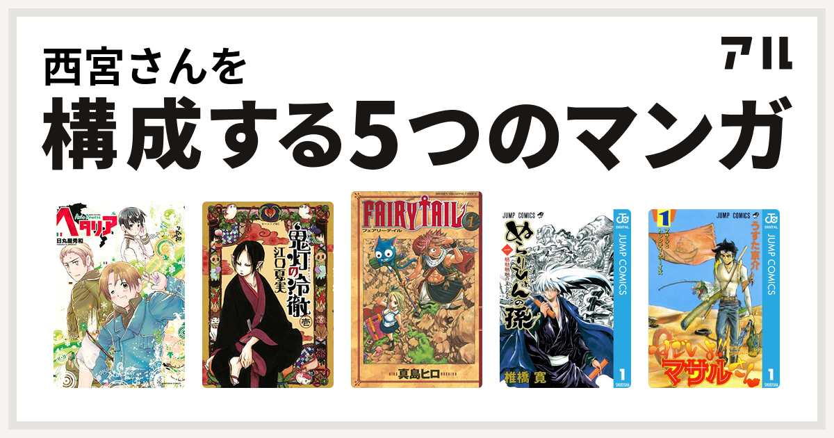 西宮さんを構成するマンガはヘタリア Axis Powers 鬼灯の冷徹 Fairy Tail ぬらりひょんの孫 セクシーコマンドー外伝 すごいよ マサルさん 私を構成する5つのマンガ アル